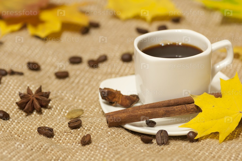 Чашка кофе на мешковине с желтыми листьями