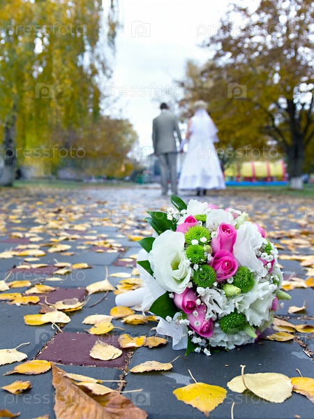 Букет невесты крупным планом и размытые молодожены