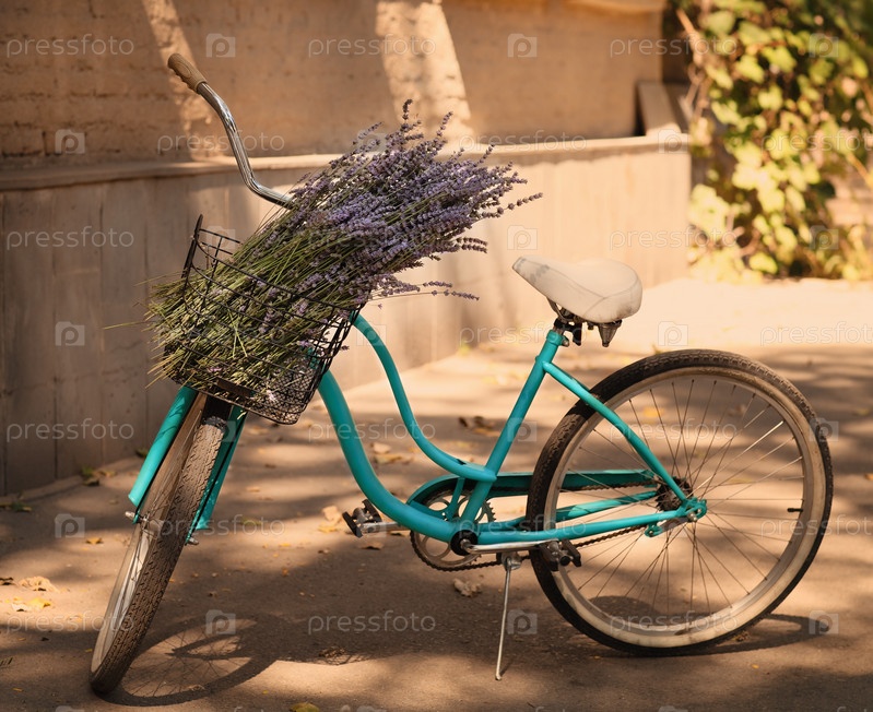Винтажный велосипед с корзиной с цветами лаванды