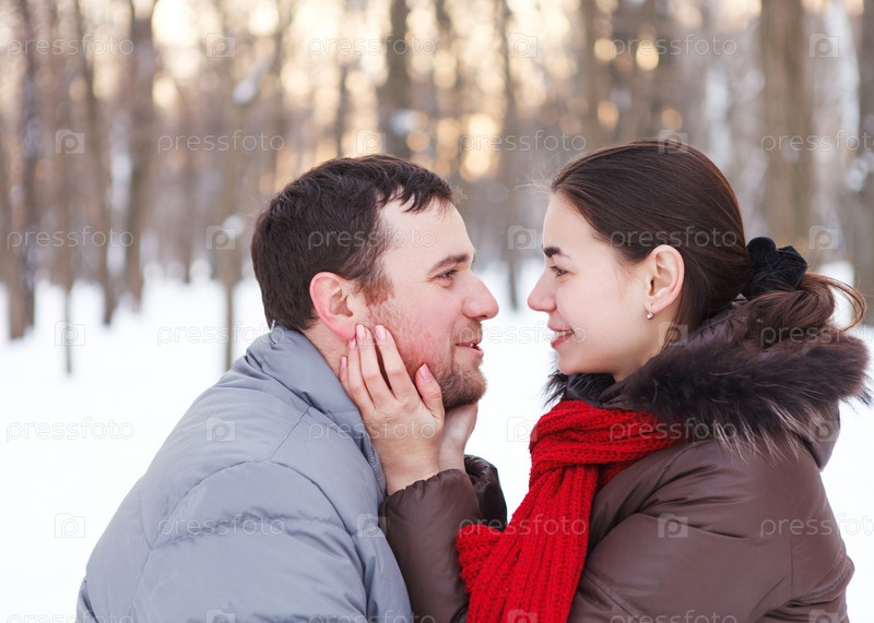 Счастливая пара отдыхает в зимнем парке