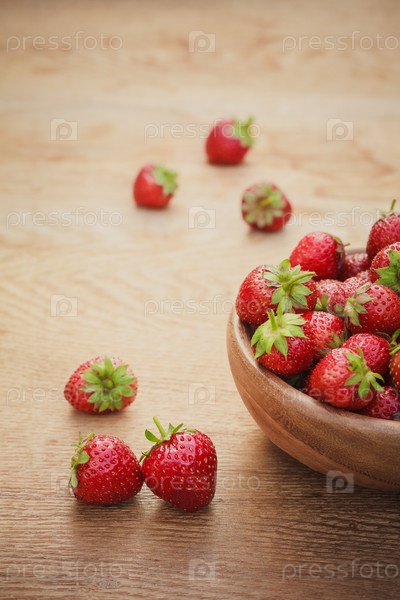 Клубника в старой деревянной чашке на столе крупным планом