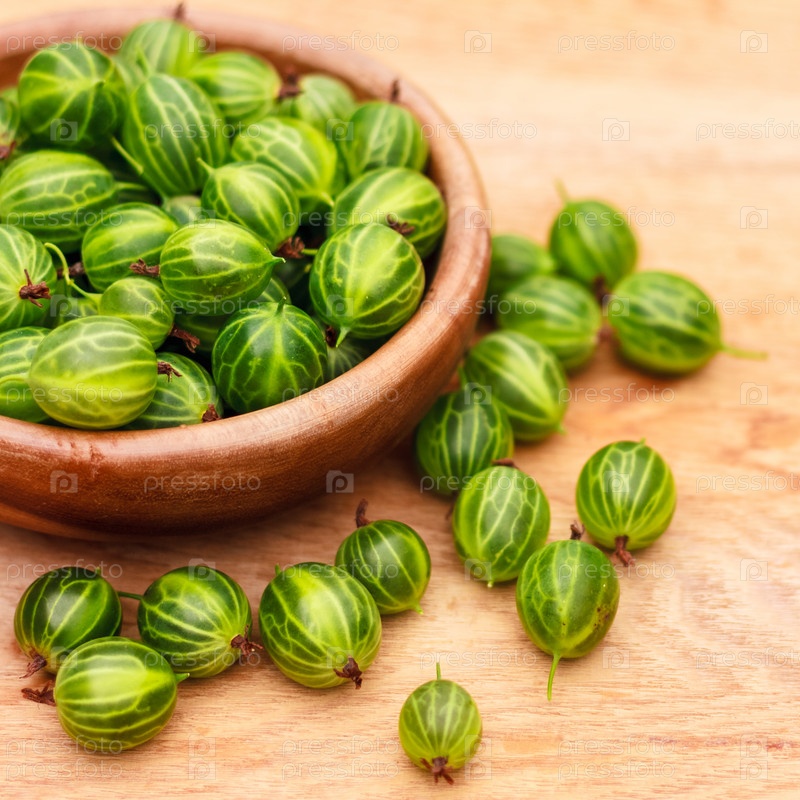 Крыжовник в старой деревянной чашке на столе крупным планом