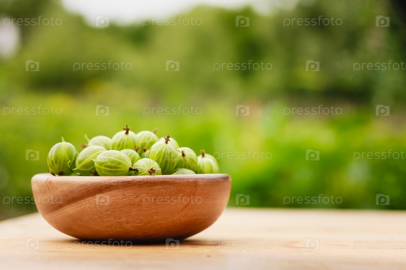 Крыжовник в старой деревянной чашке на столе крупным планом