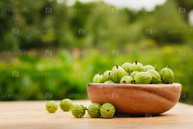 Крыжовник в старой деревянной чашке на столе крупным планом