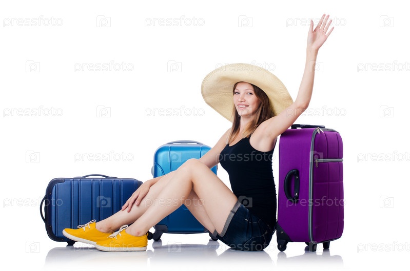 Девушка с чемоданом, изолированная на белом