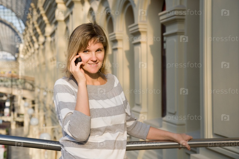 Беременная женщина говорит по телефону в магазине