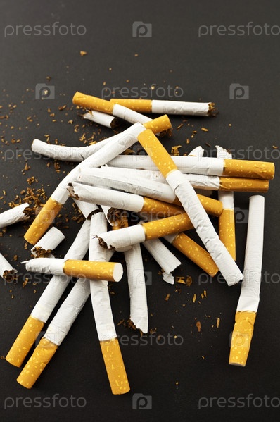 Сдавленные дробленые сигареты, разбитые на черном фоне студии