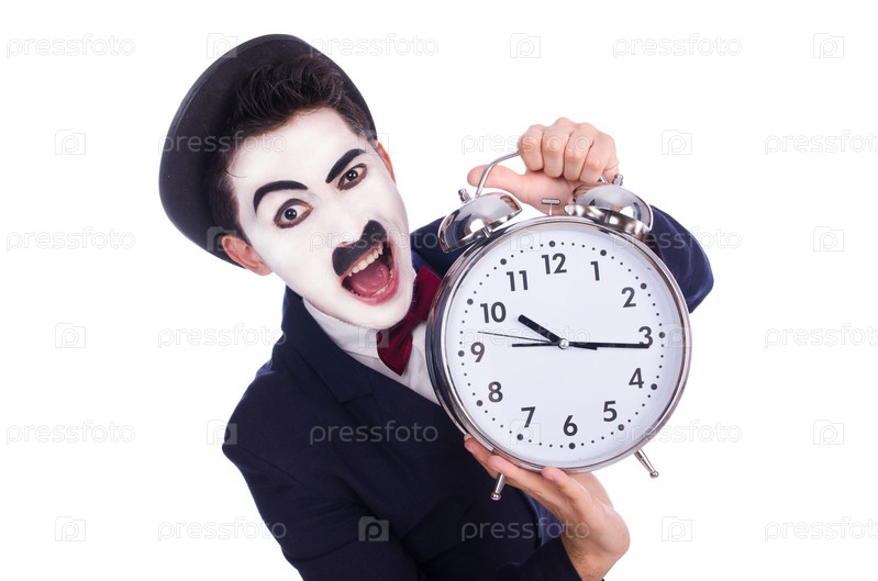 Забавный человек с часами на белом фоне