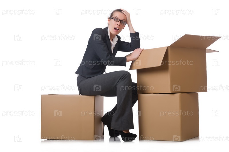 Деловая женщина с коробками на белом фоне