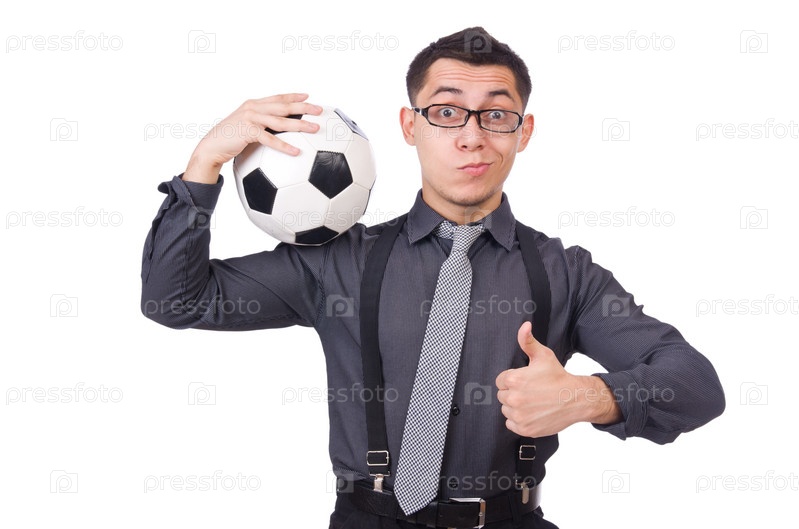 Забавный человек с футбольным мячом, изолированный на белом фоне