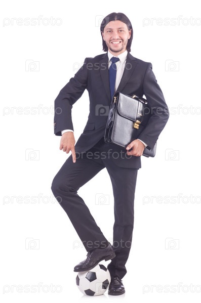 Мужчина с футбольным мячом, изолированный на белом фоне