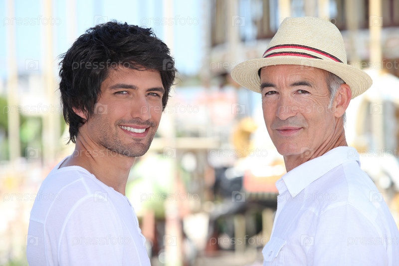 Молодой и пожилой мужчина в центре города, атмосфера летних каникул