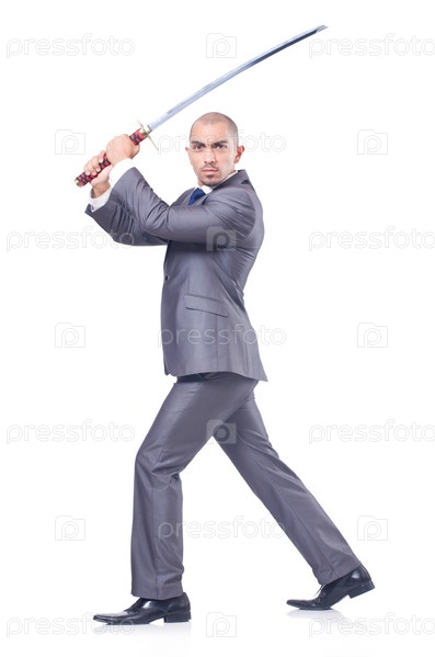 Бизнесмен с мечом, изолированный на белом фоне