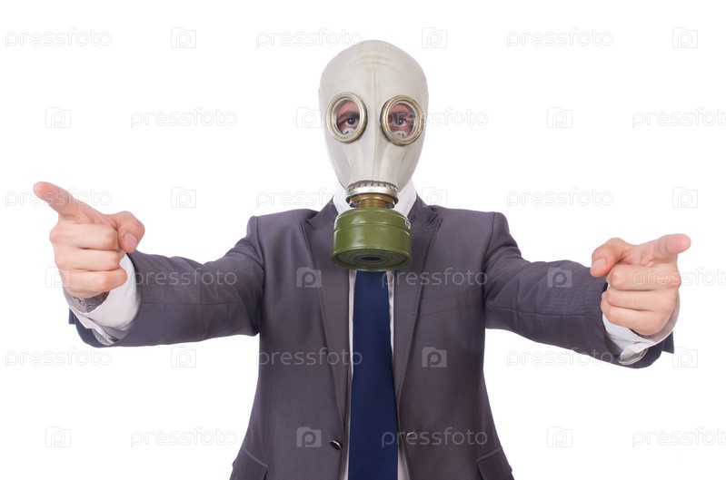 Бизнесмен в противогазе, изолированный на белом фоне