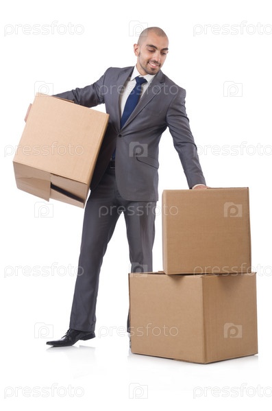 Бизнесмен с коробкой, изолированный на белом фоне