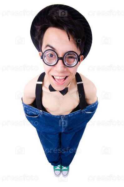 Забавный мужчина в больших брюках, изолированный на белом фоне