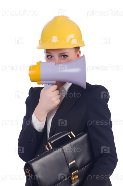 Бизнес-леди в каске на белом фоне