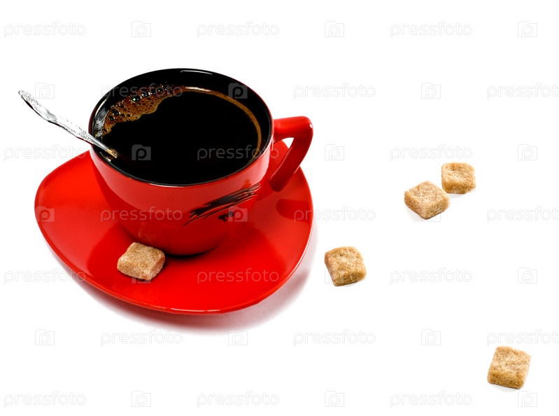 Красная чашка кофе и несколько небольших кусочков бурого сахара