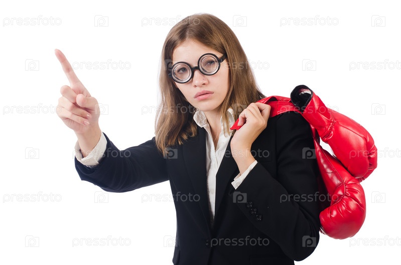 Деловая женщина в боксерских перчатках на белом фоне