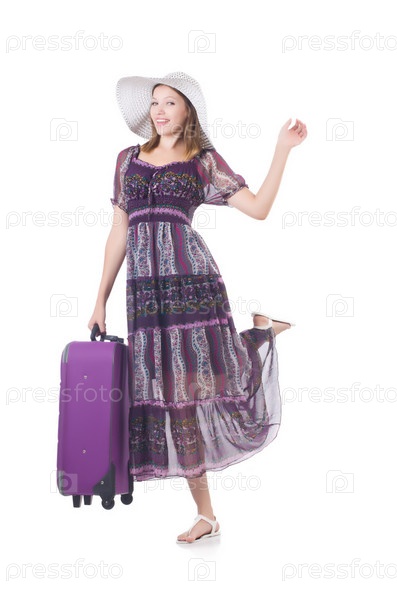 Девушка с чемоданами, изолированная на белом фоне