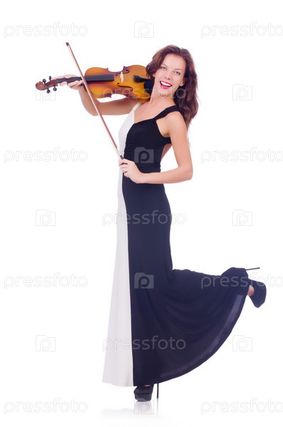 Молодая девушка со скрипкой на белом фоне