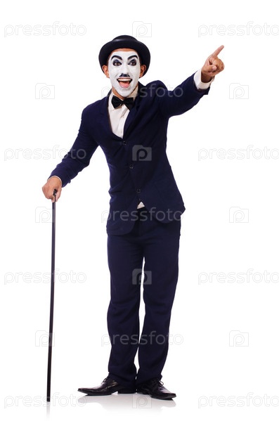 Человек в костюме Чарли Чаплина на белом фоне