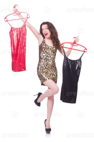 Женщина меряет новую одежду на белом фоне