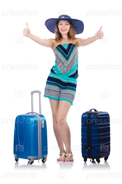 Женщина с чемоданами на белом фоне