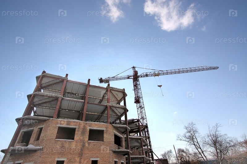 Башенный кран возле строящегося дома на фоне неба