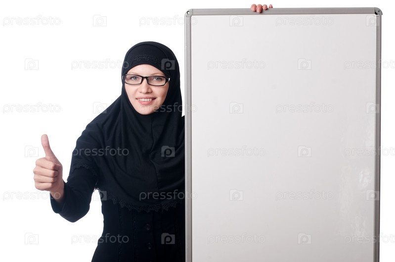 Мусульманская женщина с пустым баннером на белом фоне