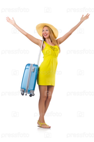 Девушка с чемоданами, изолированная на белом фоне