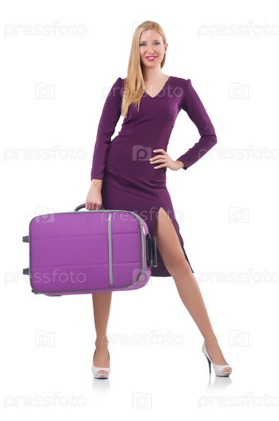 Девушка с чемоданами, изолированная на белом фоне