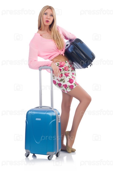 Девушка с чемоданами, изолированная на белом фоне