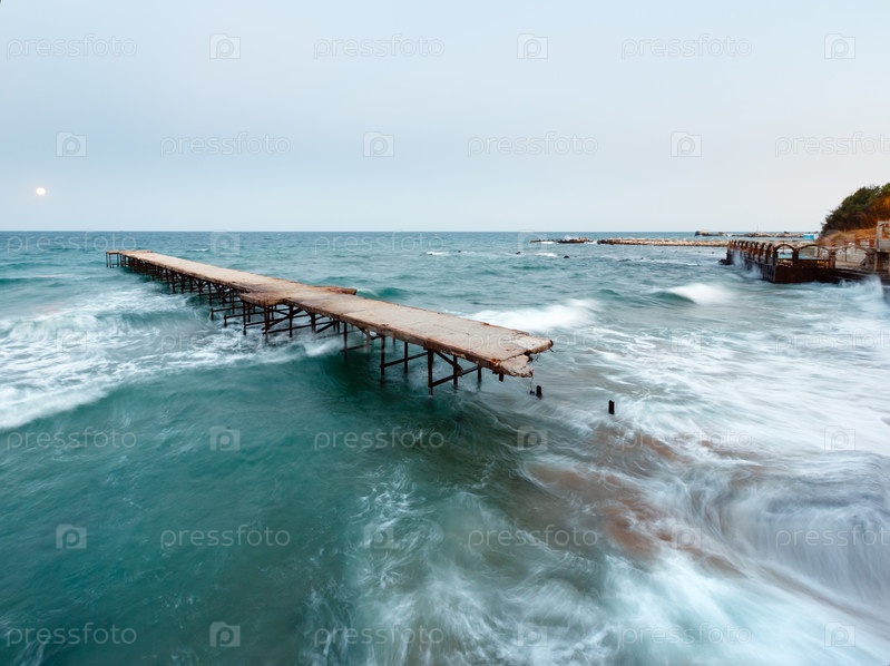 Вечерний морской прибой, разрушенный пирс и луна в небе (Черное море, Болгария). Долгая экспозиция