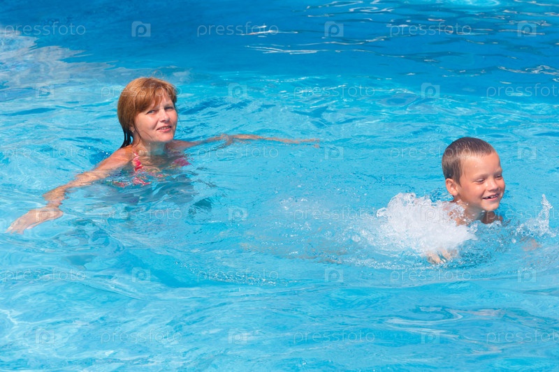 Мать учит сына плавать в бассейне