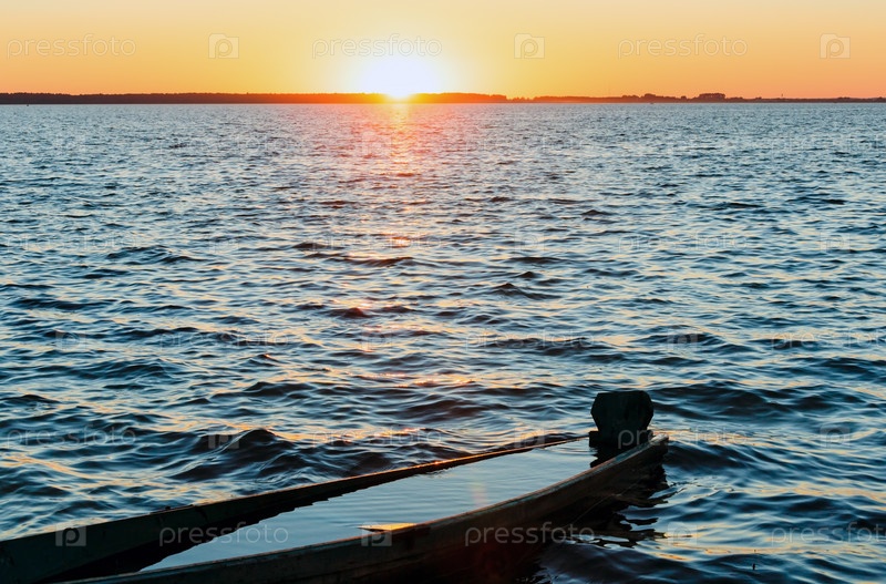Закат и затопленная моторная лодка на берегу озера летом