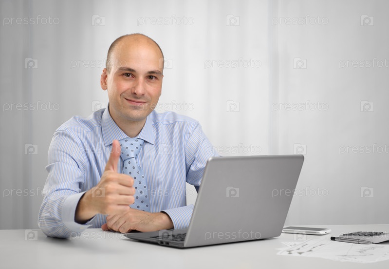 Бизнесмен с ноутбуком показывает большой палец