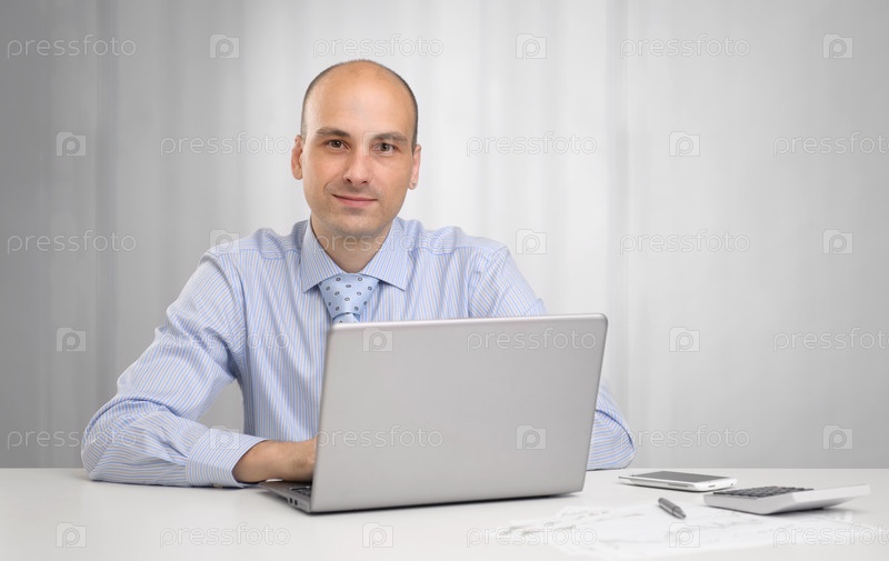 Красивый бизнесмен работает на ноутбуке, сидя за столом