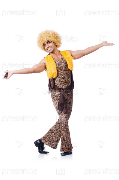 Мужчина с афро и микрофоном, изолированный на белом фоне