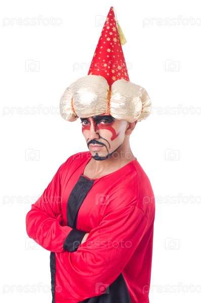 Маг в красном костюме, изолированный на белом фоне