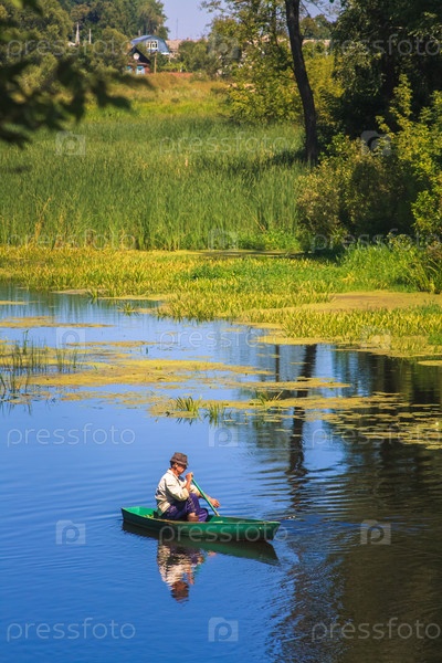 Человек рыбачит с весельной лодки