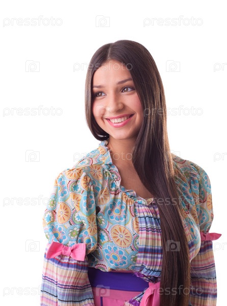 Портрет молодой улыбающейся девушки в восточном национальном костюме на белом фоне