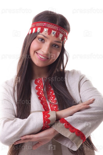 Портрет молодой улыбающейся девушки в национальном костюме на белом фоне