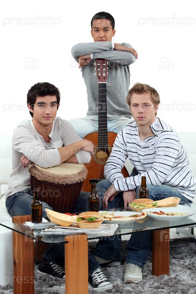 Молодые люди с музыкальными инструментами дома