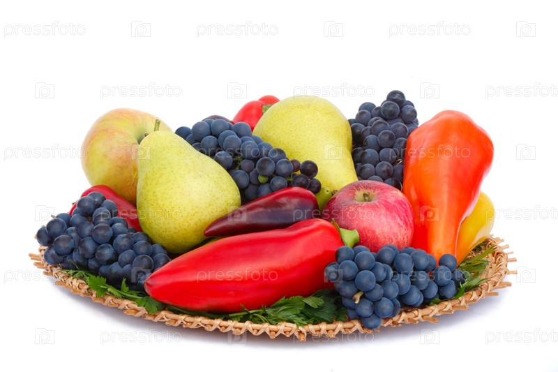 Фрукты, перец и петрушка на тарелке на белом фоне
