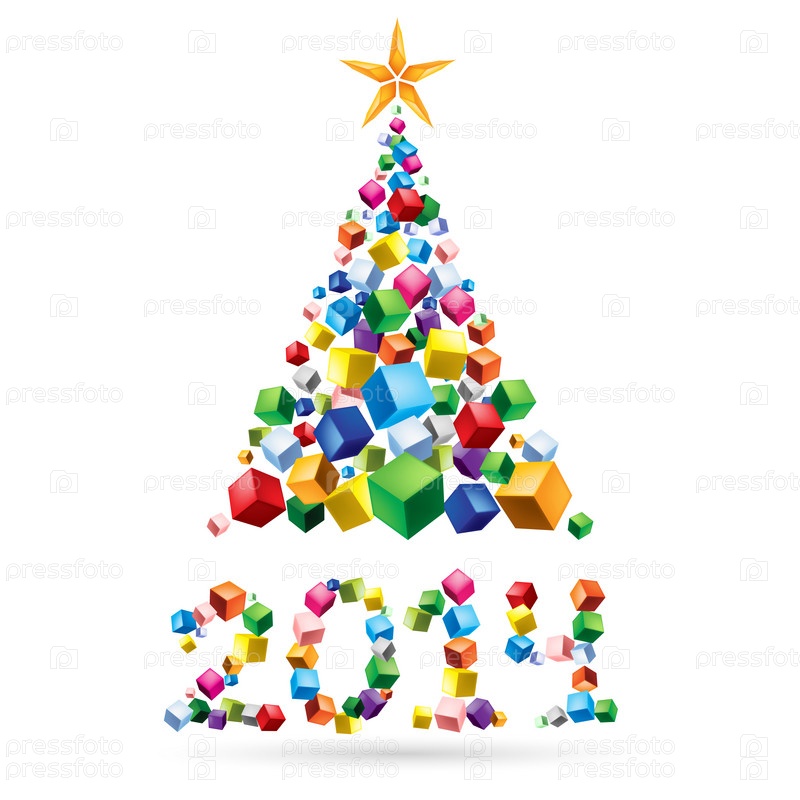 Поздравительная открытка: абстрактная елка и цифра 2014 из красочных кубиков