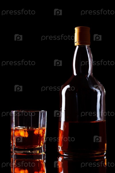 Бутылка и стакан виски на черном фоне