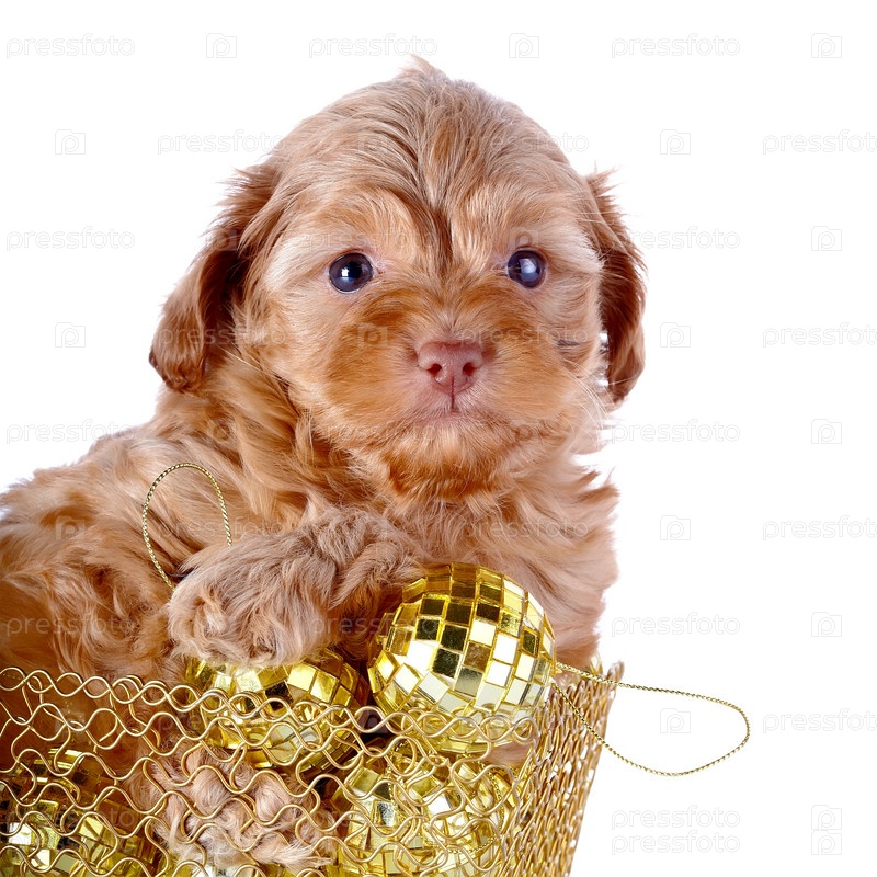 Щенок породы петербургская орхидея с елочными шарами