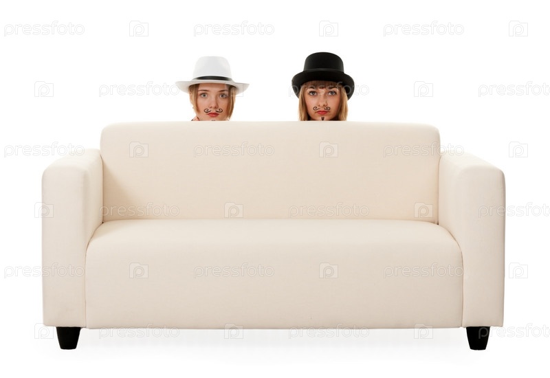Две девушки с нарисованными усами за диваном, на белом фоне