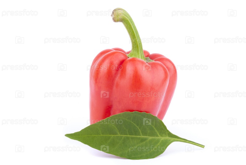 Красный сладкий перец с листком на белом фоне
